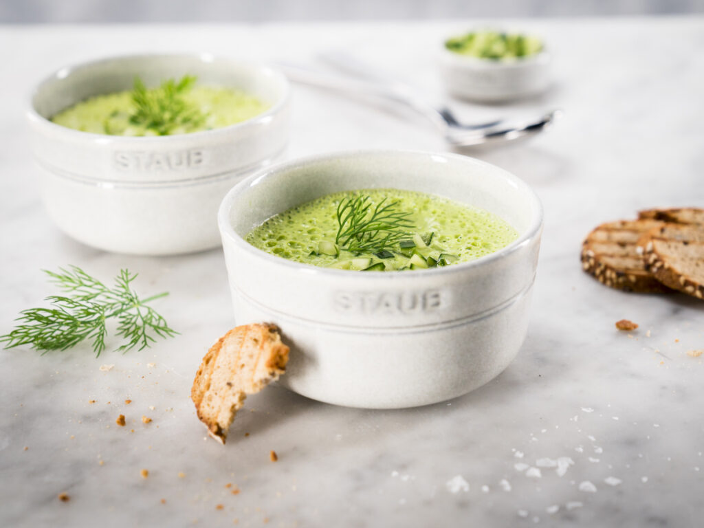 El pepino es casi todo agua, y ligarlo con una base grasa (como yogur griego o aceite de oliva) para que quede cremosa y estable es complejo.